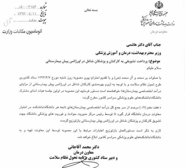 باتوجه به اجرای طرح تحول نظام سلامت وپیگیری مسئولین مرکزمدیریت حوادث وفوریتهای پزشکی کشورطی نامه ای ازجانب معاون محترم درمان وزارت بهداشت مصوب گردید کارکنان وپزشکان شاغل اورژانس پیش بیمارستانی، ازمزایای ۷ دهم درصد درآمداختصاصی بیمارستان ها بهره مندگردند.